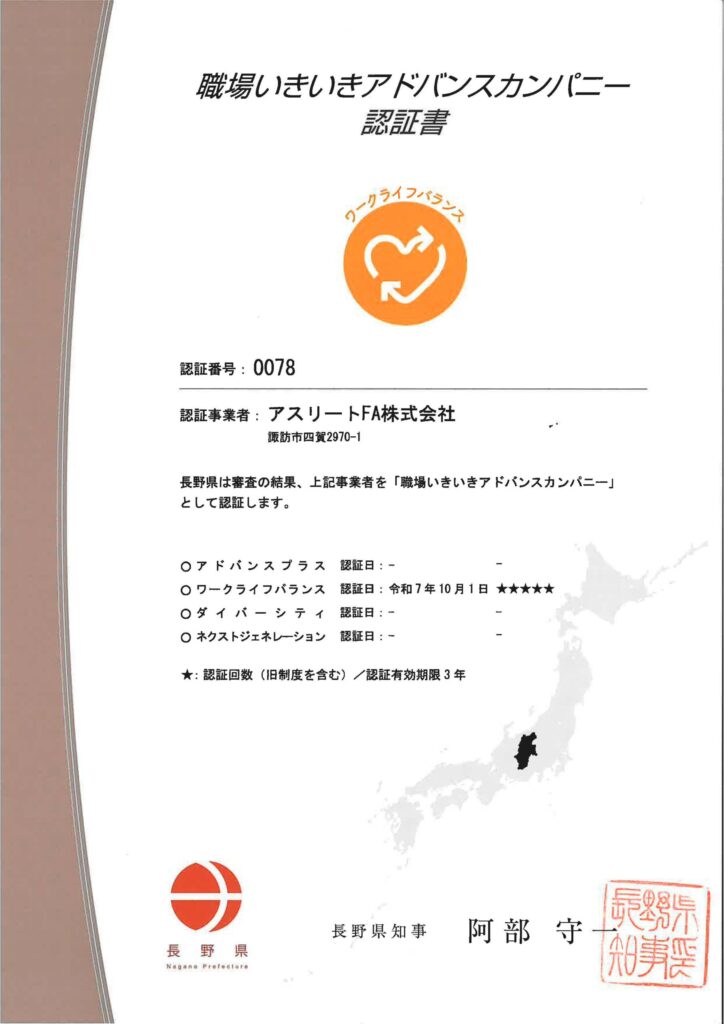 このたび、アスリートFA株式会社は「職場いきいきアドバンスカンパニー」の認証を受けました。